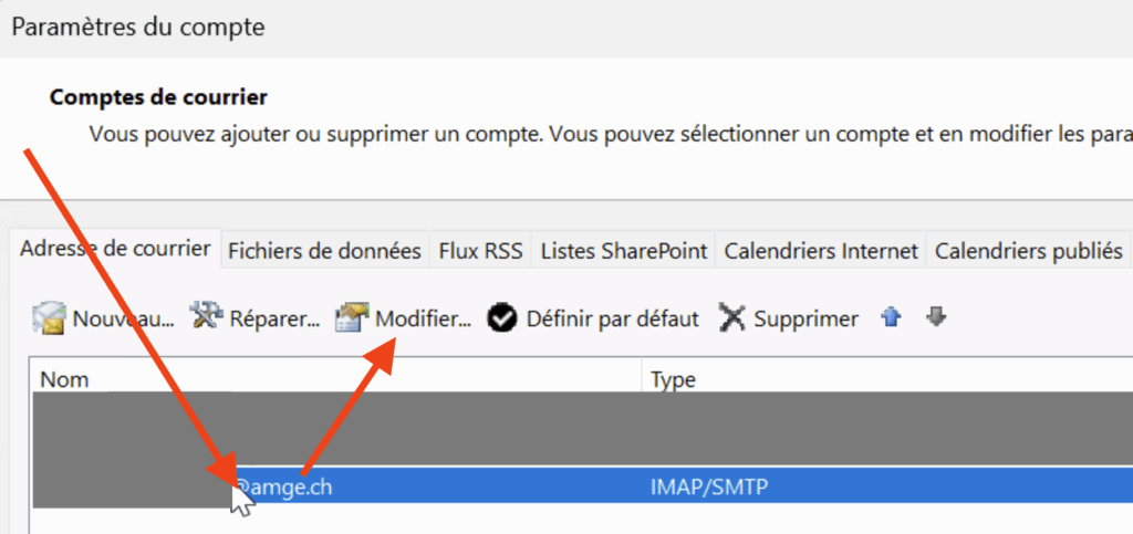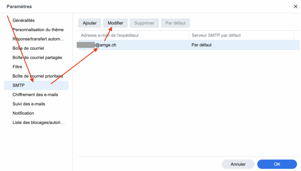 • Allez dans la section SMTP, sélectionnez votre adresse puis cliquez sur “Modifier”