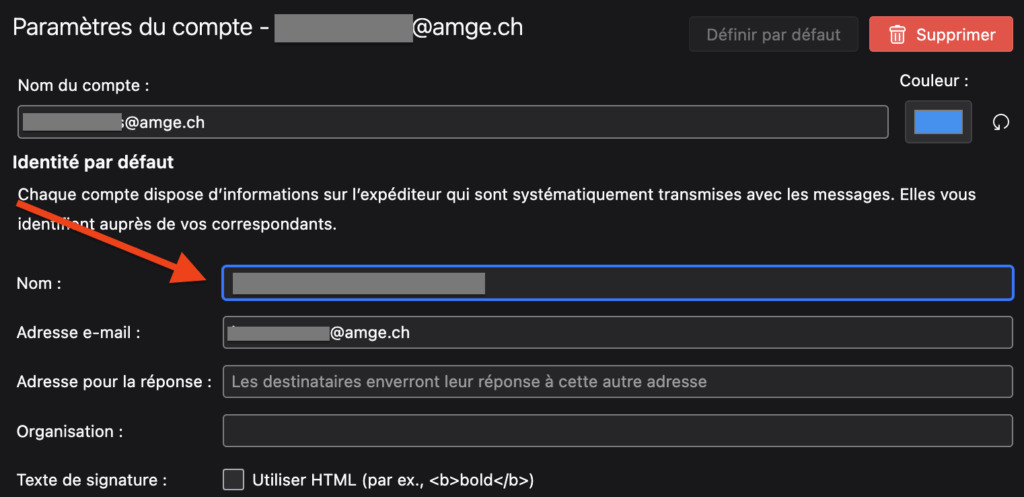 Quand vous envoyez un email, c’est le logiciel que vous utilisez pour le faire qui indique le nom qui sera affiché à votre destinaire. Ce réglage est généralement dans les paramètres du serveur d’envoi (SMTP). Vous trouverez des instructions détaillées pour les logiciels les plus communs ci-dessous: