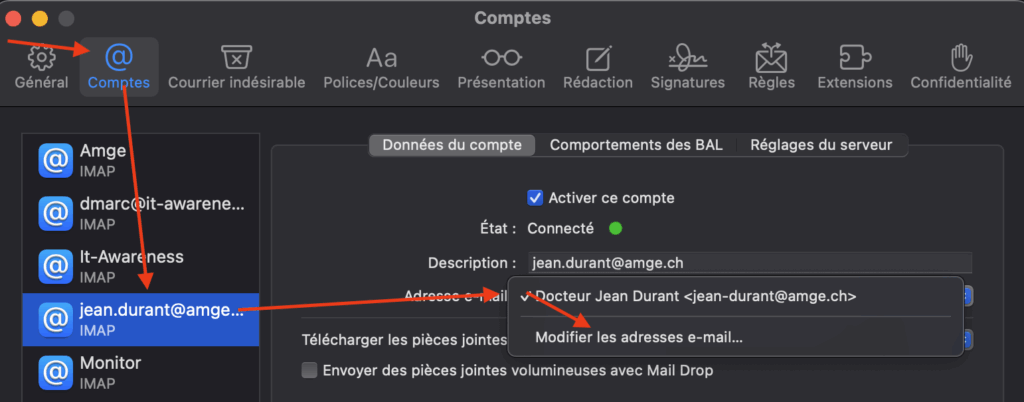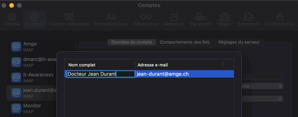 Accédez au réglages de Mail (pas “Comptes” ! ) puis dans l’onglet comptes, choisissez votre adresse AMGe et cliquez sur “Modifier les adresses mail”. Vous pouvez changer le Nom Complet en double cliquant dessus.