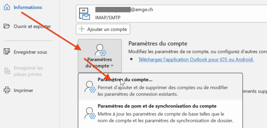 Ouvrez l’onglet “Fichier” en haut à gauche d’Outlook puis dans Paramètres du compte. Sélectionnez votre adresse AMGe puis cliquez sur le bouton modifier. Vous pourrez modifier le nom affiché à vos destinataires dans le champs Votre nom