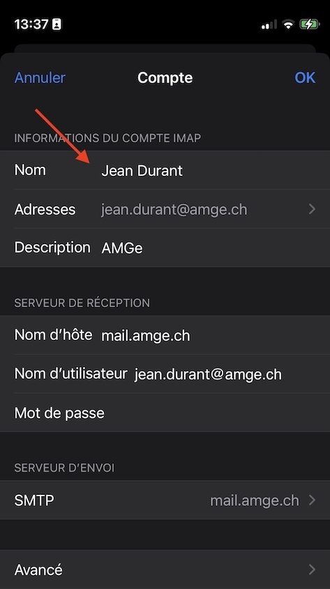 Rendez-vous dans les réglages de l’iPhone puis dans la section pour l’application Mail. Vous trouverez le champs Nom dans les informations du compte.