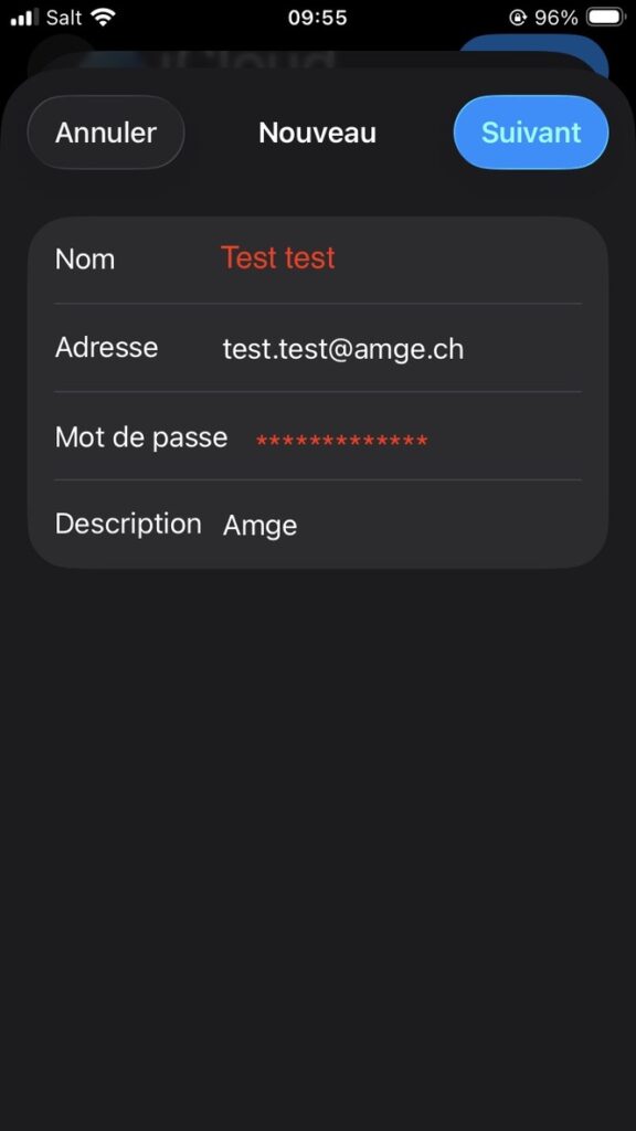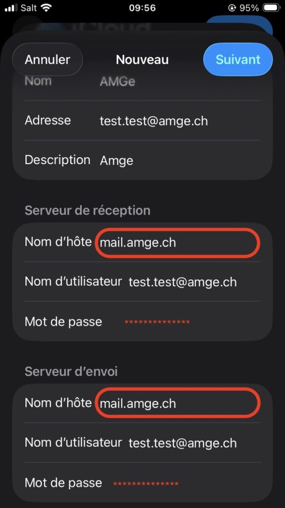 ⚠️ Attention, Apple pré-rempli automatiquement le premier champ “Serveur de réception – Nom d’hôte” avec une valeur erronée. Remplacez la valeur par “mail.amge.ch”.