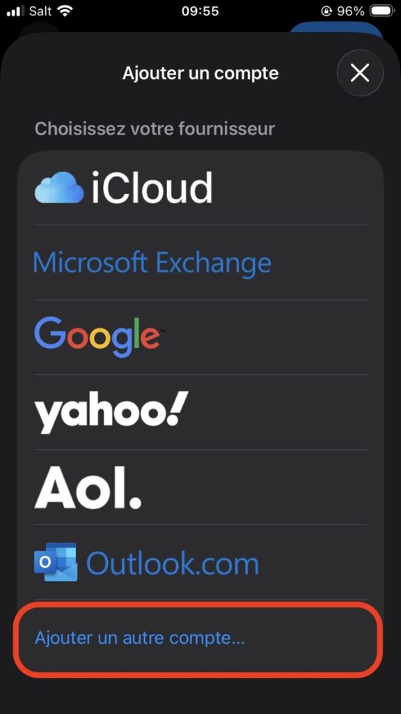 Touchez “Ajouter un autre compte…” en bas de l’écran :