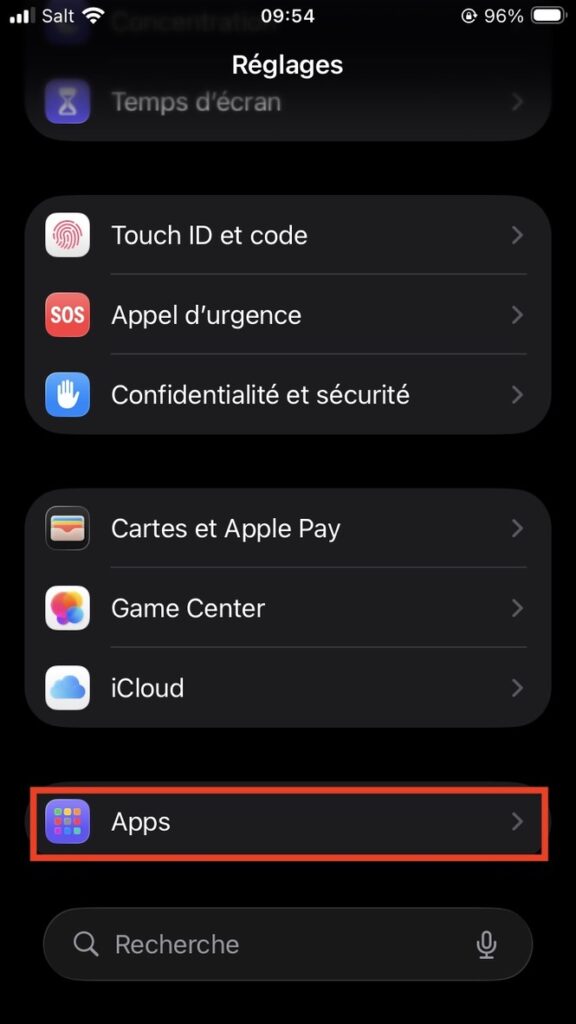 Ouvrez les “Réglages” de votre iPhone/iPad, défilez jusqu’en bas et choisissez “Apps” :