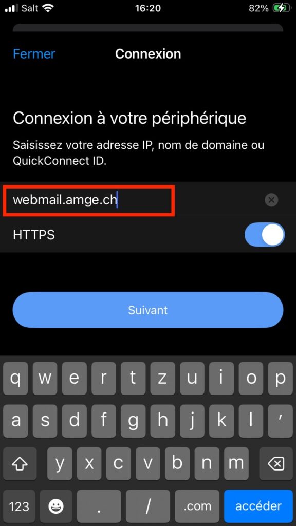 Saisissez le nom de domaine webmail.amge.ch dans l’encadré. Assurez-vous d’activer la case HTTPS par défaut et cliquez sur le bouton “Suivant”.